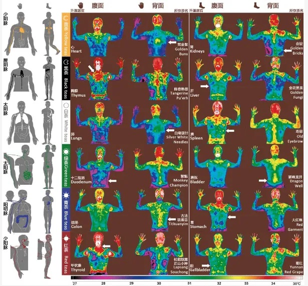 研究发现:不同茶叶对应不同的归经。绿茶对应太阳脉、红茶对应少阳脉、黑茶对应厥阴脉、青茶对应阳明脉,白茶对应太阴脉等。比较特殊的是,黄茶的归经并不清晰。
