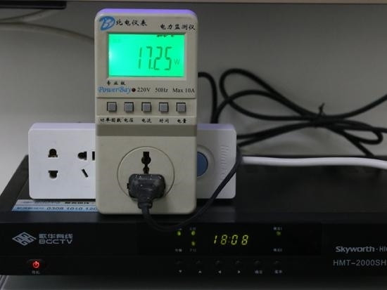 最后,我们来看看数字机顶盒的待机功率究竟是多少。如图所示,数字机顶盒在关闭状态下的功率为0,但是当启动机顶盒后,其瞬时功率达到了17.25W,此时我们可以看到机顶盒显示时间,电视机此时没有开启,机顶盒也没有与电视产生数据传输。当我们打开电视后,机顶盒与电视产生数据传输时机顶盒的功率为 17.61W。